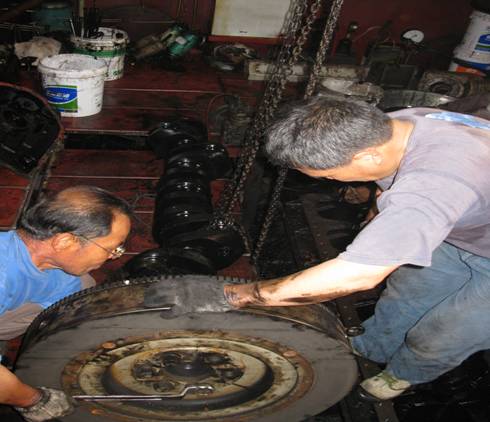 胡師傅在對主機曲軸飛輪組進行檢查維修