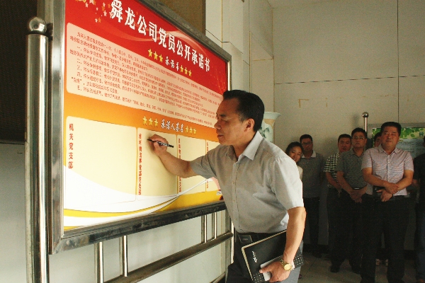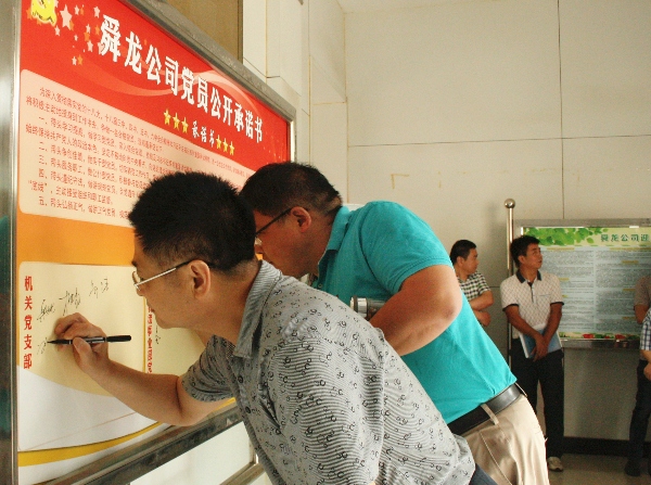 為紀(jì)念中國(guó)共產(chǎn)黨成立96周年,6月26日上午,舜龍公司在一樓大廳莊嚴(yán)舉行了黨員公開(kāi)承諾簽字儀式。公司黨員干部圍繞“五個(gè)帶頭”(帶頭學(xué)習(xí)提高,做學(xué)習(xí)型黨員;帶頭爭(zhēng)創(chuàng)佳績(jī),做實(shí)干型黨員;帶頭服務(wù)職工,做公仆型黨員;帶頭遵紀(jì)守法,做講規(guī)矩黨員;帶頭弘揚(yáng)正氣,做講正氣黨員)作出了鄭重承諾。