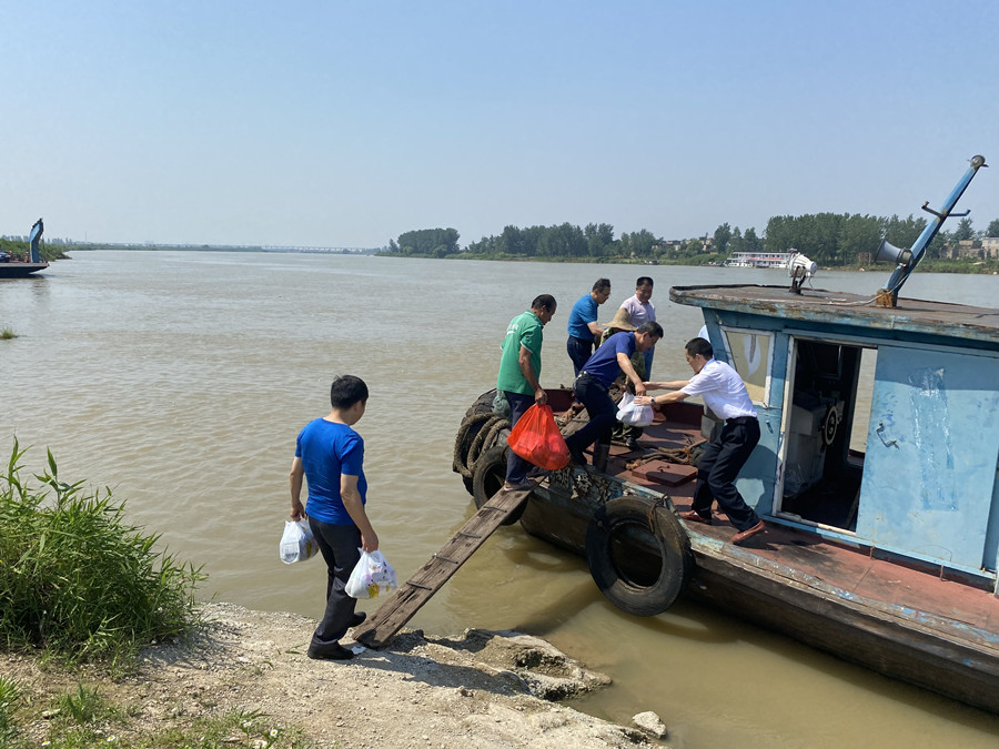 公司領(lǐng)導(dǎo)在何臺渡口攜帶防暑降溫物品準(zhǔn)備登船
