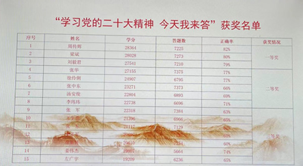 此次活動公司黨委高度重視,對活動參與方式、獎勵等精心安排部署,并專門下發(fā)了《關(guān)于“學(xué)習(xí)黨的二十大精神 今天我來答”有獎競答活動的通知》。公司黨委要求各級領(lǐng)導(dǎo)干部帶頭參與,全體黨員積極響應(yīng),在崗黨員參與率達(dá)到了100%,學(xué)分在20000分以上的達(dá)到了13人。經(jīng)過100天的學(xué)習(xí)競答,評選出一等獎3人,二等獎5人,三等獎7人。