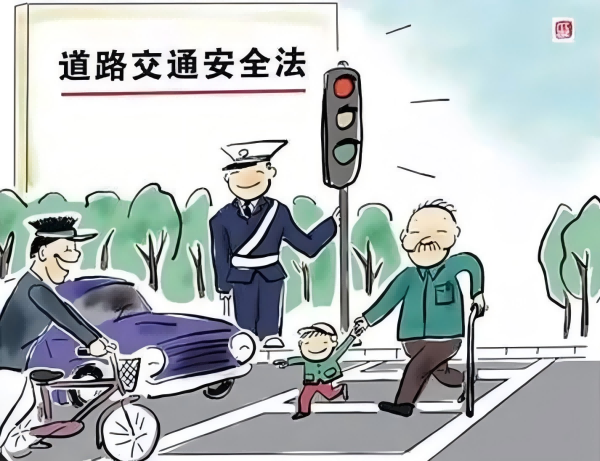 行人過馬路走人行橫道,過路口時認真觀察來往車輛。